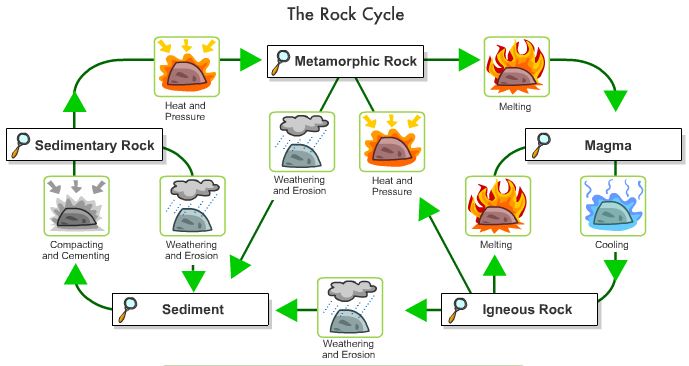 The rock cycle is a model geologists use to explain the endless cycle of change that rocks undergo. The main idea is that rocks are continually changing from one type to another and back again, as forces inside the earth bring them closer to the surface (where they are weathered, eroded, and compacted) and forces on the earth sink them back down (where they are heated, pressed, and melted). The rock cycle helps us to see that the earth is like a giant rock recycling machine!